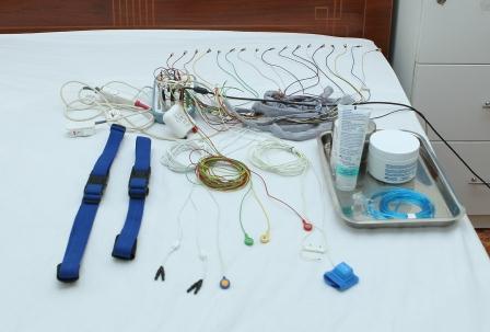 Ảnh chuẩn bị điện cực, dụng cụ gắn máy đa ký giấc ngủ Alice 6 cho bệnh nhân tại Phôi Việt