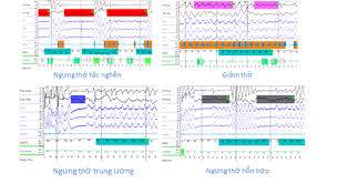 • Đa ký giấc ngủ: Xác định được các sự kiện về hô hấp nhiều hơn đa ký hô hấp, các sự kiện về sóng não để xác định thời gian thức ngủ, cử động chân, rối loạn tim mạch, tư thế nằm ngủ nào gây ra ngưng thở nhiều, giai đoạn nào bị ngưng thở nhiều…
